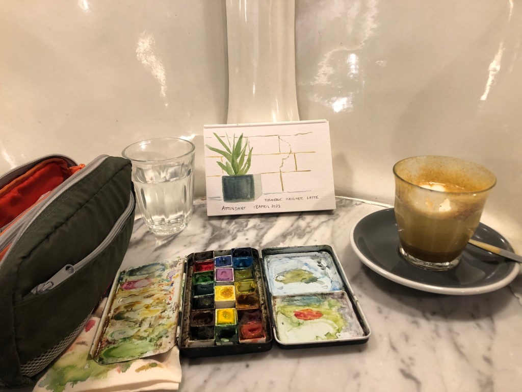 It’s Monday evening; today we hopped on a bus, went to find a coffee place that used to be a public convenience! Underground. Spiffed up and tidy. We both chose the Wellness Latte: Turmeric, Mint Matcha Chai. Delicious. Then on to Liberty and ARKET, and MinaLima, slightly disappointing, as it now is only ONE floor of Harry Potter wonder, whereas in 2019 there were at least 3 floors. I waited in a tea shop (Gail’s), thinking Ilena would enjoy the Harry Potter connection more than I, and met two charming Turkish students, one in fashion, one in architecture. We exchanged instagram info—new friends! Pleasant Lady Jian Bing was closed! So on to the V&A (but wait—the art store diversion! CASS art supply) for FOOD (delicious) and Beatrix Potter. And cake and coffee. We were ushered out of the V&A around 5:30, walked to Knightsbridge Station, took underground to HOME. Stopped at Boots for essentials.