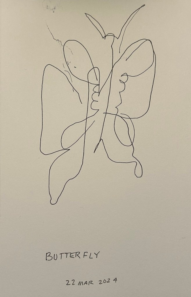 I’m calling these “Blindies” to differentiate them from blind contour drawings. For a blindie, one doesn’t look at the drawing in progress, just as with a blind contour. The difference is, one keeps one’s eyes closed, looking only at a mental picture. I started doing these when my eye doc told me to sit still with eyes closed for 3 minutes after adding drops to my eyes. The results are sometimes hilarious, sometimes awkward, sometimes recognizable, but always interesting. And generally continuous line, in which one goes not lift the pen from the paper.